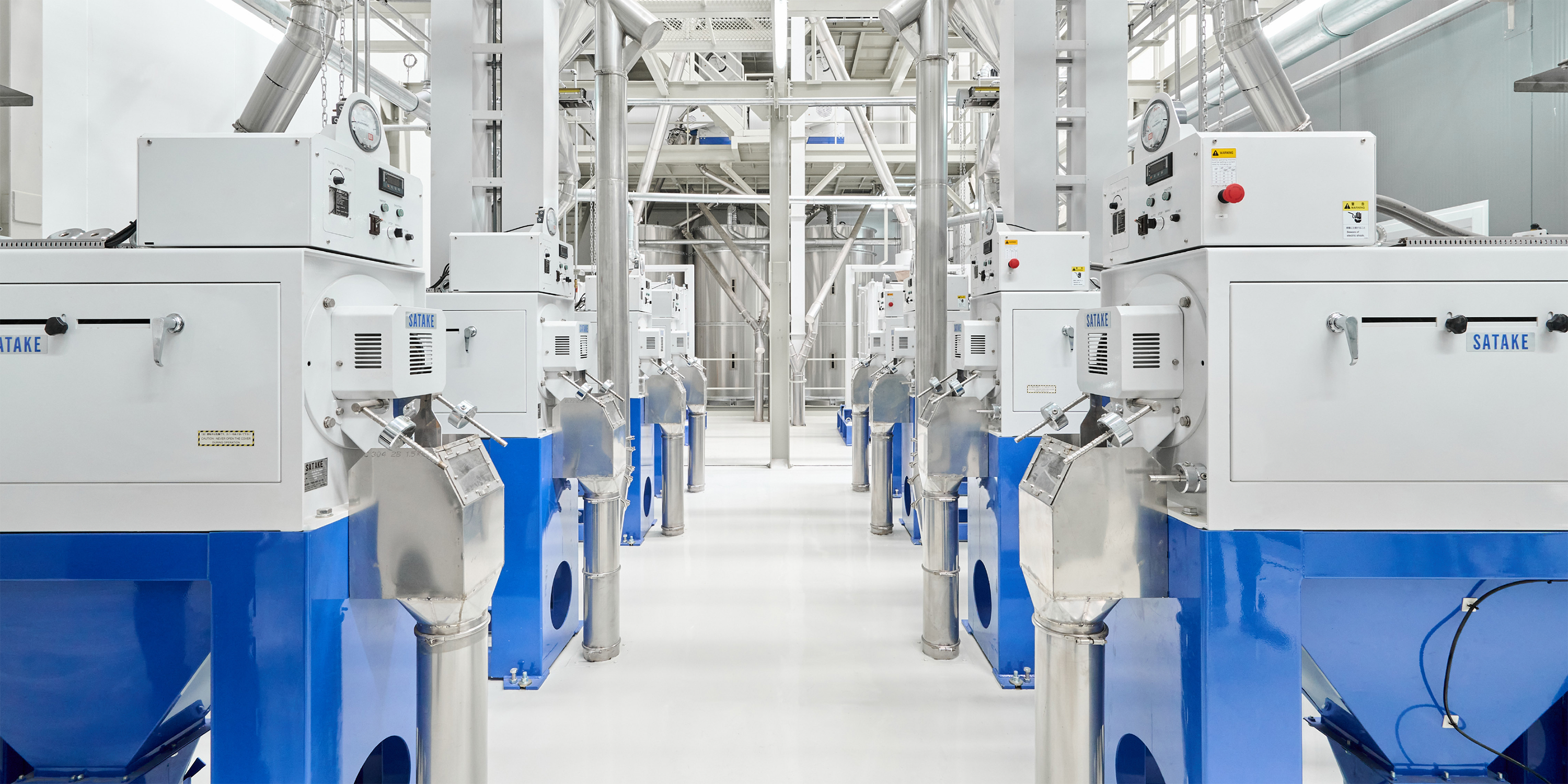 Processed rice is stored in stainless steel silos to maintain freshness and quality.